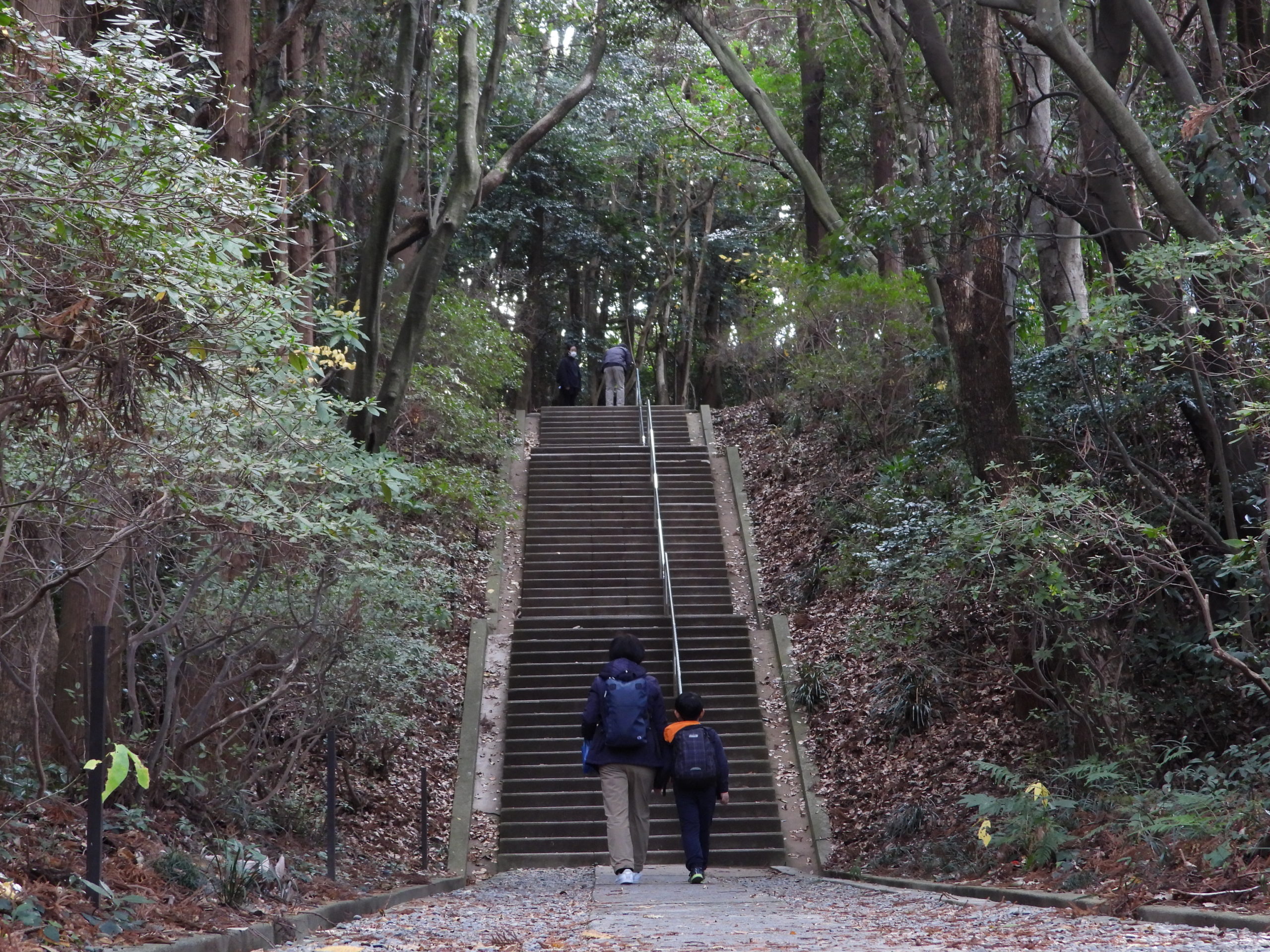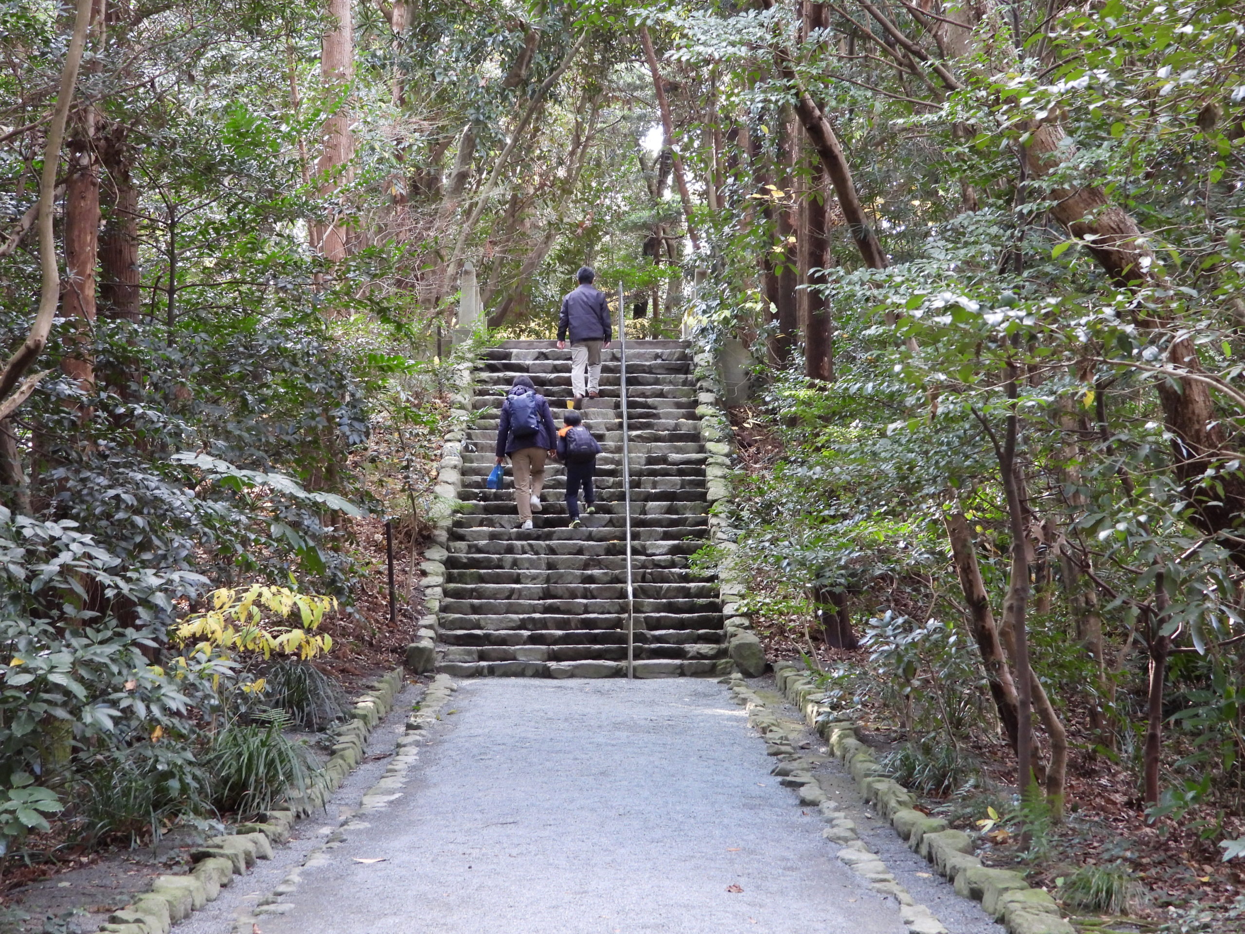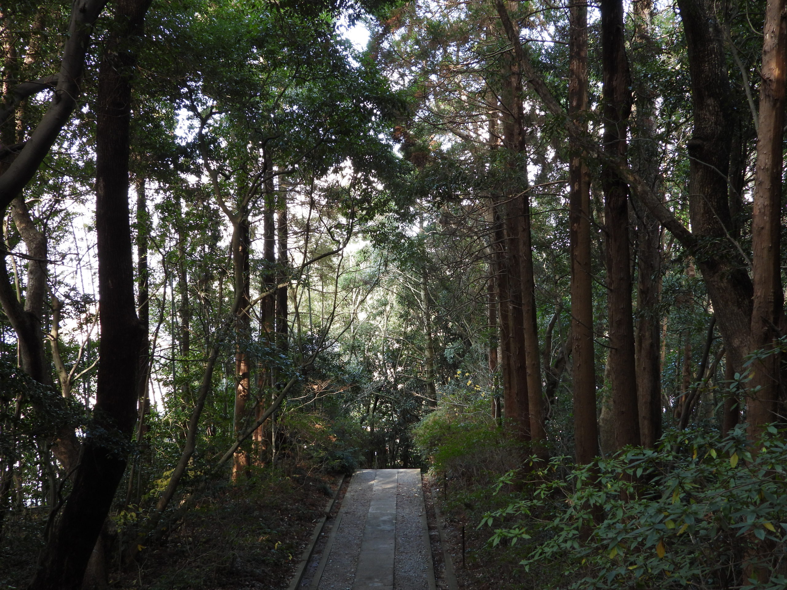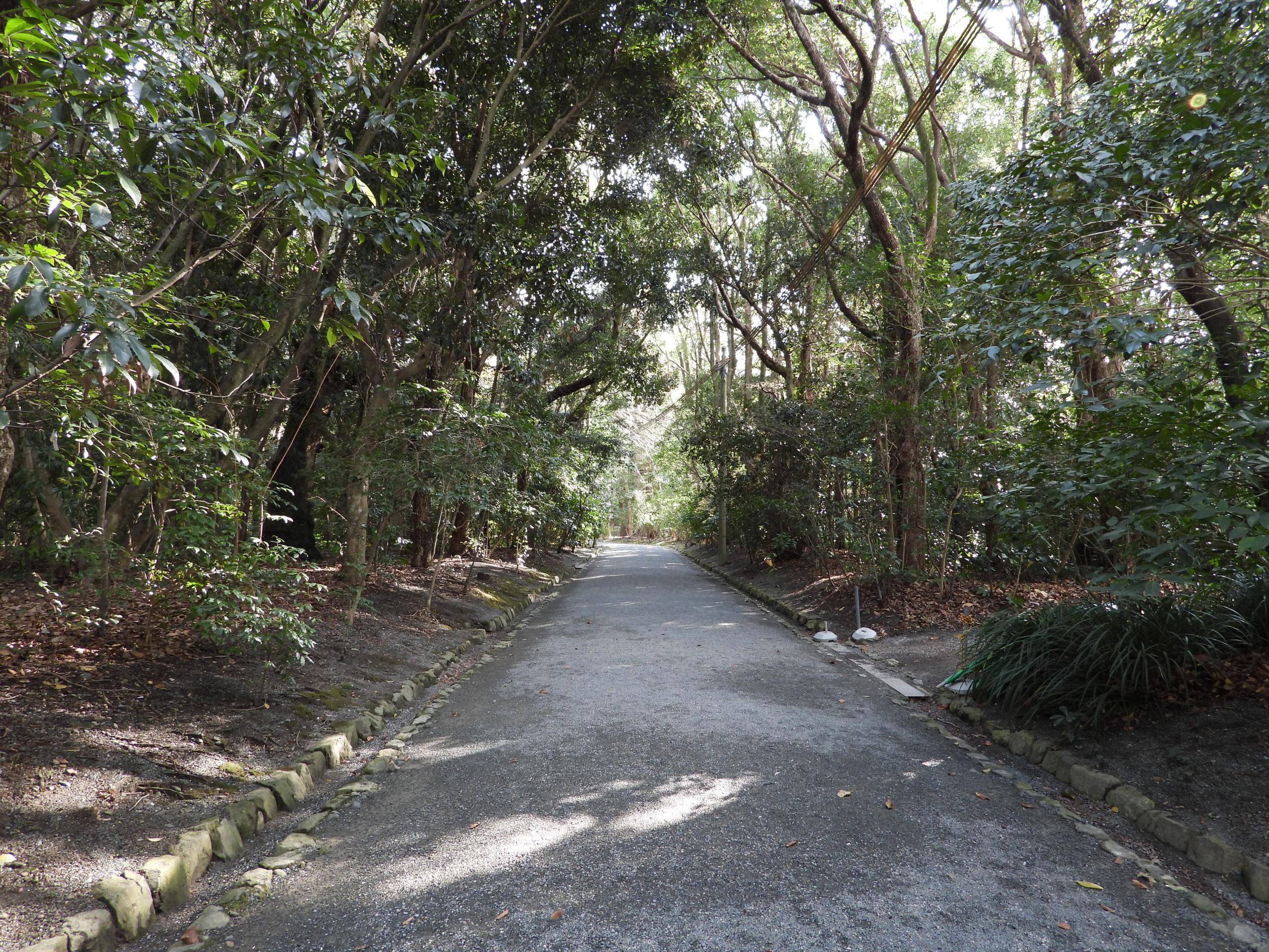 正面にある辺津宮の左側にある高宮祭場への入口を通ると、下のような緑に囲まれた通路があり、この参道を未知なりに5分ほど歩いていくと、高宮祭場につくことができます。