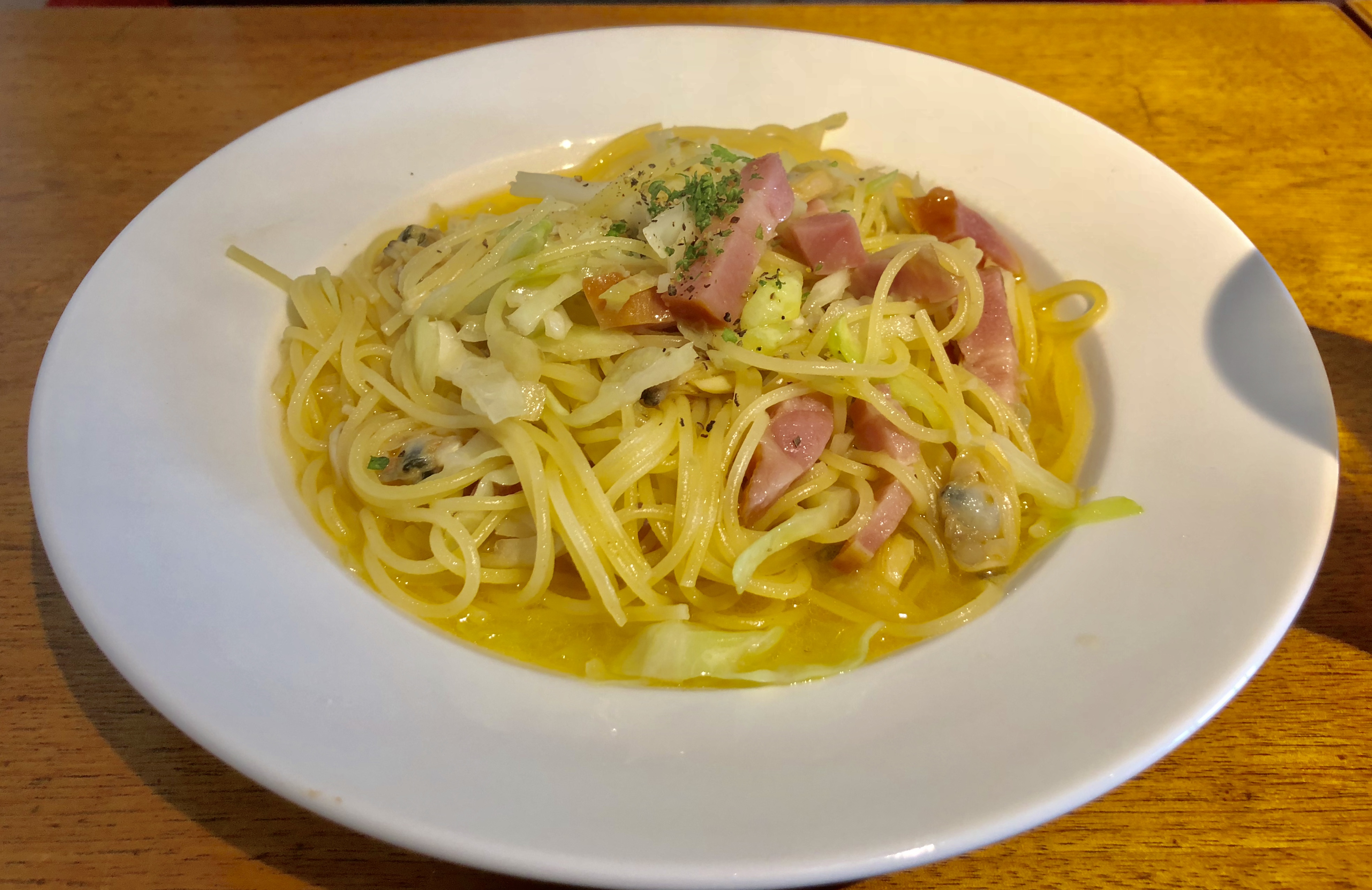 そしてこちらが、ベーコンとアサリ、キャベツのペペロンチーノ。